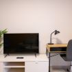 The apartment features a desk area next to the large window, designed for those who need to work remotely with plenty of natural light and comfort. A computer monitor is included with your booking, along with high-speed fibre WiFi.