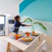 π With a Nordic inspiration, light tones were selected for walls, furniture and flooring, and an evocative tricolor mural was arranged in the dining area. Relaxation guaranteed!